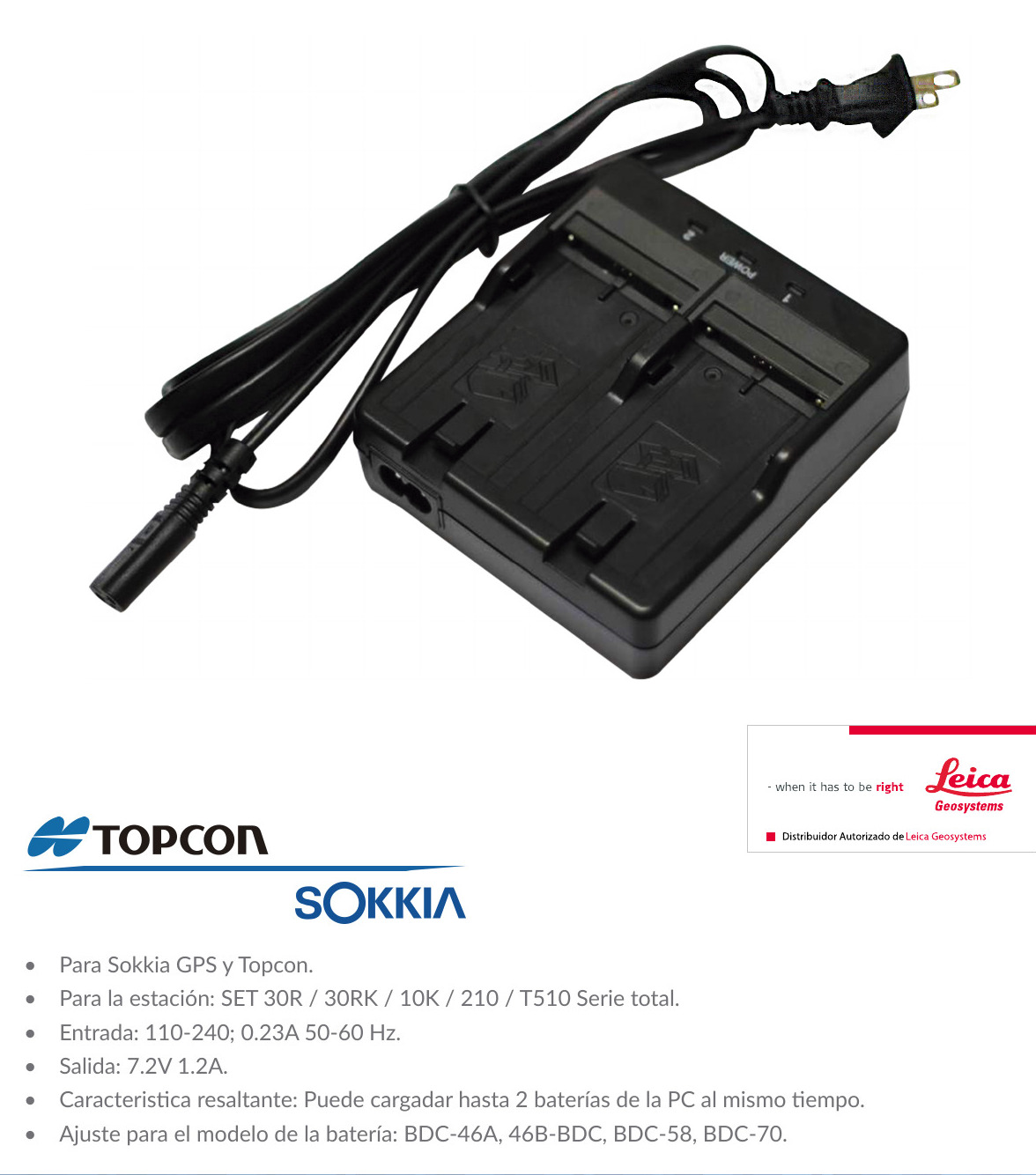Funciona con baterías Topcon BDC70 y Sokkia BDC46, BDC58, BDC70