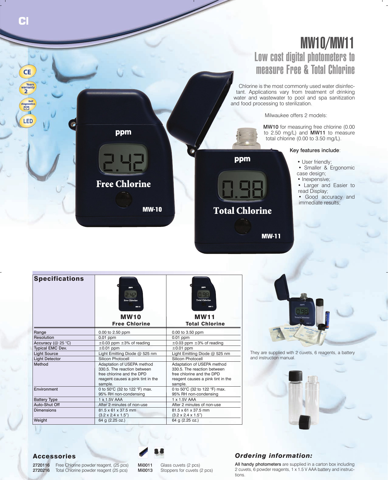 Revolucionario nuevo fotómetro El tamaño compacto para un uso fácil. Y fácil de usar. El diseño es moderno. Cloro libre(MW10) Cloro total (MW11) Fosfato (MW12) Yodo (MW13) Hierro (MW14)MW10 MilwaukeeY simplicidad al medir en minutos. El resultado se mostrará en la pantalla LCD y se apagará automáticamente después de no usarlo en 2 minutos para ahorrar batería. Además, funcionará de la misma manera. Medidor de cloro Otras versiones