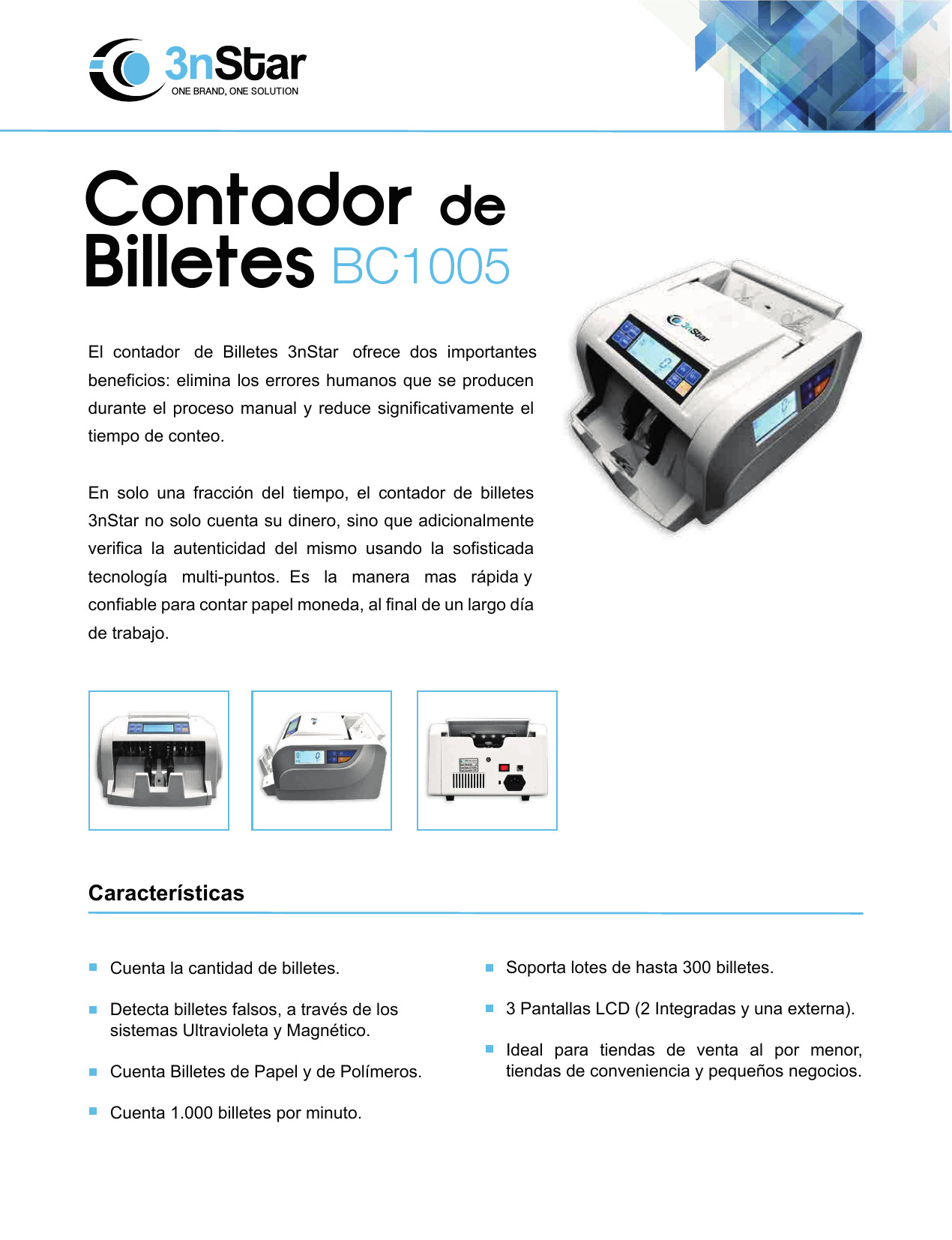 El contador de Billetes 3nStar ofrece dos importantes beneficios: elimina los errores humanos que se producen durante el proceso manual y reduce significativamente el tiempo de conteo.