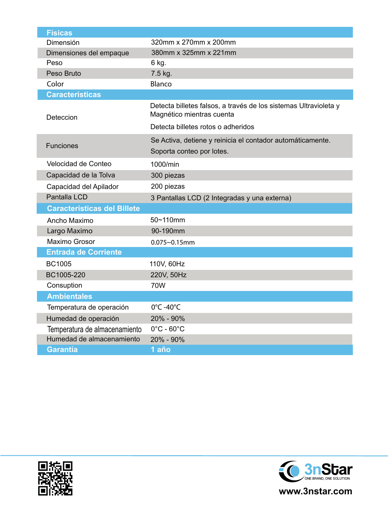 CONTADOR DE BILLETES 3NSTAR RAPIDEZ DE CONTEO 1000 BILLS/MIN 2 PANTALLAS LCD SOPORTA BILLETES DE PAPEL Y POLIMEROS ( BC1005 )
