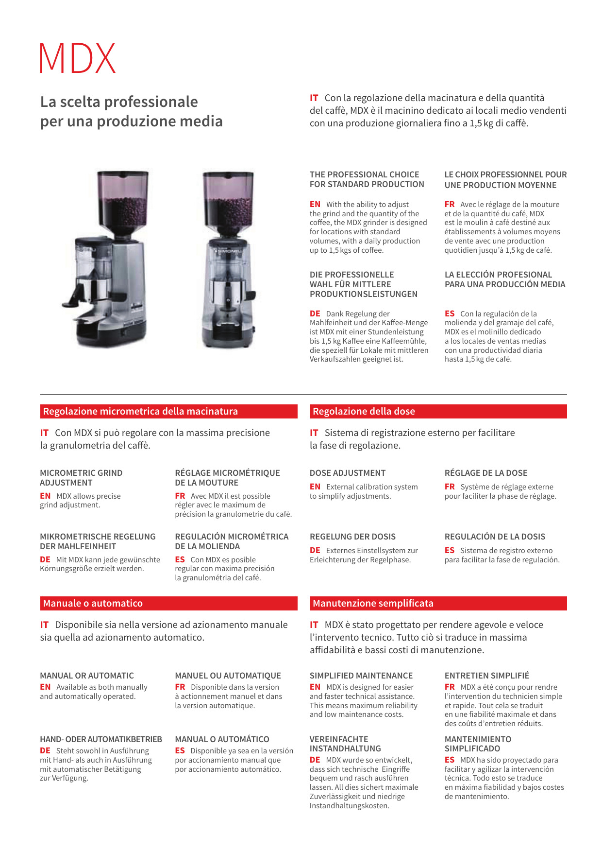 Para aquellos que tienen una producción diaria inferior a 2 kg de café, MDX es la solución profesional para optimizar el rendimiento y los costos. MDX está disponible en una versión de funcionamiento automático para una molienda rápida para evitar el desperdicio.