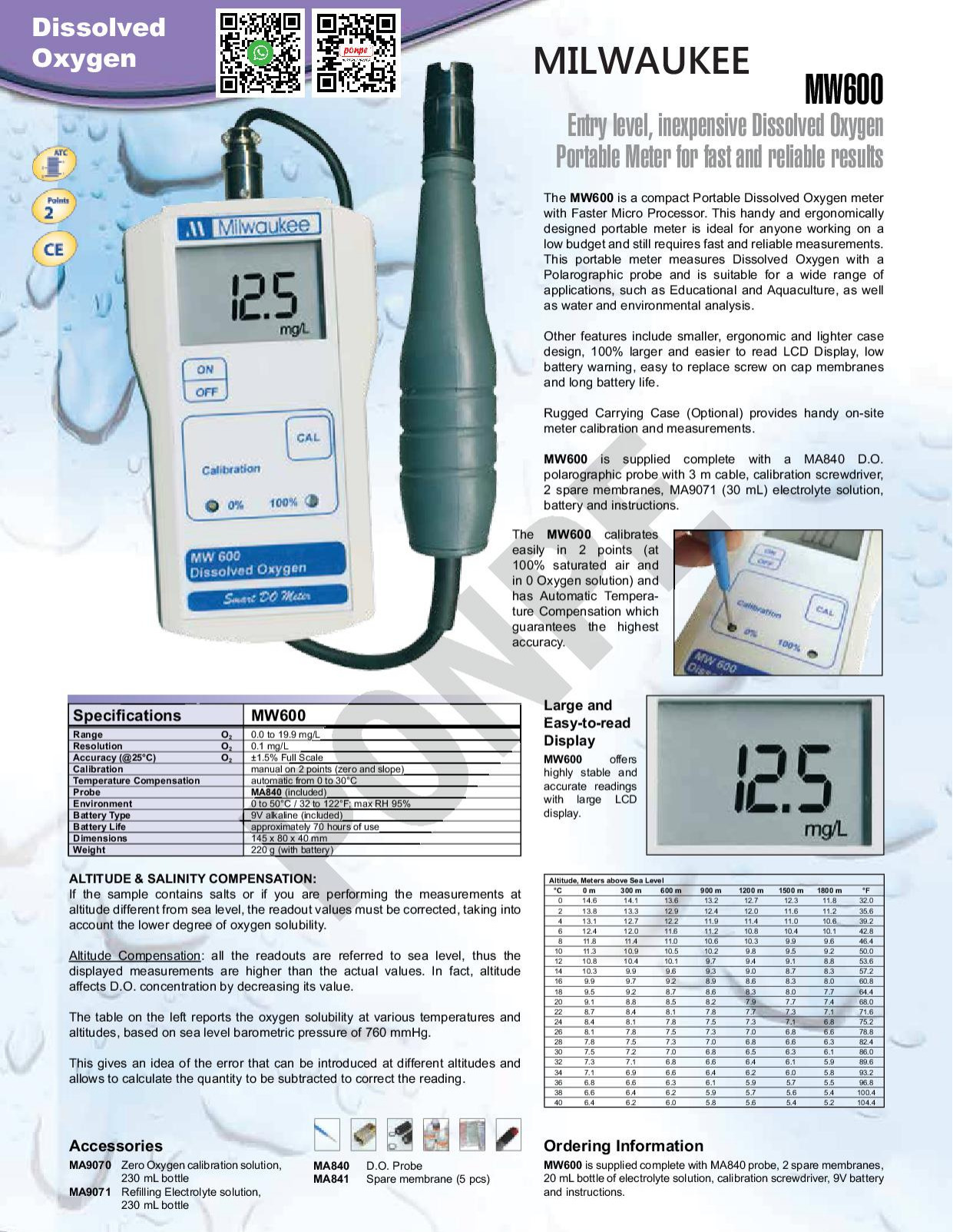 El MW600 es un medidor portátil de oxígeno disuelto ideal para uso en educación, laboratorios, acuicultura, medio ambiente, tratamiento de aguas residuales o manejo de estanques y arroyos. Las mediciones precisas de oxígeno disuelto en cualquier lugar son importantes y donde los niveles de oxígeno se monitorean continuamente para obtener un rendimiento óptimo.