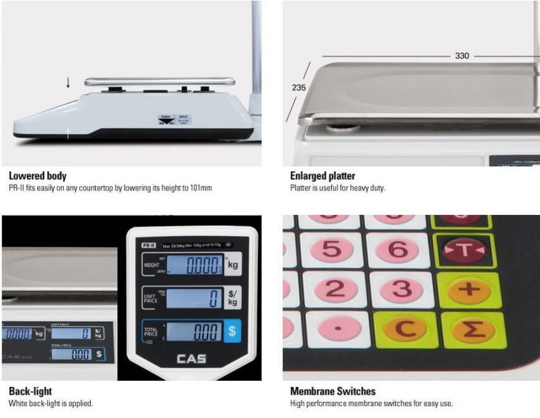 La capacidad de pesaje es de 6 kg hasta 30 kg con una precisión máxima de 1/15.000, y al bajar su altura corporal, el PR-II es ahora incluso ideal para salas limitadas de mercados abiertos.