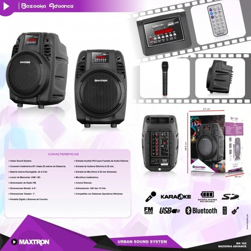 Sistema de audio portátil Maxtron Bazooka Advance con conexión inalámbrica BT (hasta 20 metros de distancia), lector de memorias USB/SD, sintonizador de radio FM, pantalla digital y botones de función, control remoto y micrófono inalámbrico. Posee entrada auxiliar RCA para fuentes de audio externas, entrada para guitarra eléctrica y es compatible con TV, DVD, smartphones, tablets y otros equipos. Además, cuenta con baterÃa interna recargable de 4.5 Ah.