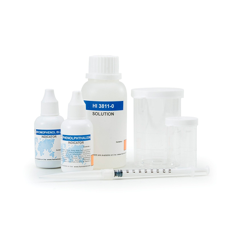 El HI3811 es un kit de prueba química que mide la alcalinidad por titulación con ácido clorhídrico. El HI3811 se suministra completo con todos los reactivos y equipos necesarios para realizar aproximadamente 110 pruebas.—El HI3811 es un kit de prueba químico basado en titulación que determina la concentración de alcalinidad en muestras dentro de un rango de 0 a 100 mg / L (ppm) CaCO 3 o 0 a 300 mg / L CaCO 3 . El HI3811 se suministra con todos los reactivos y equipos necesarios para realizar el análisis. El kit de prueba contiene suficientes reactivos para realizar aproximadamente 110 pruebas.
