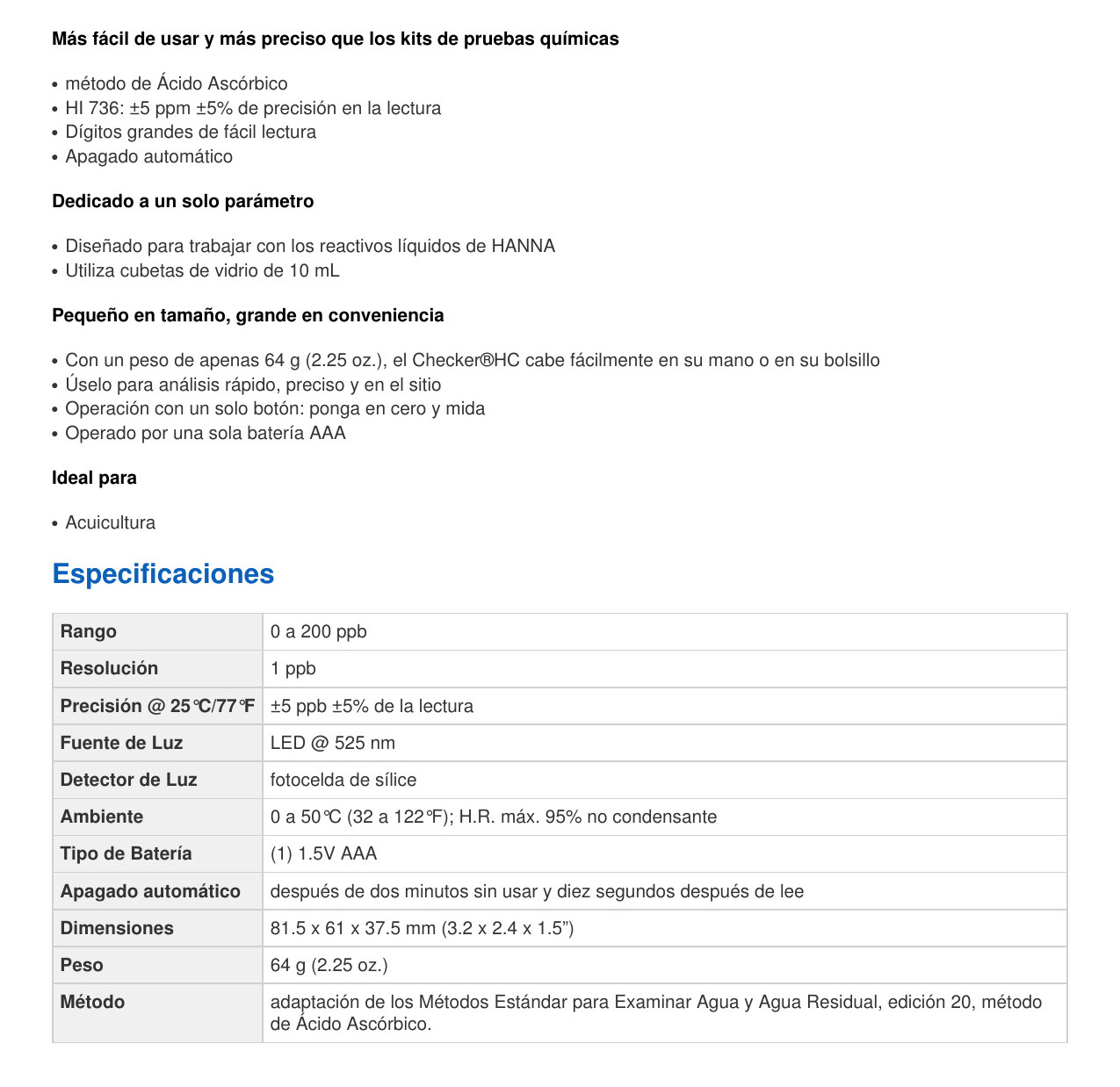 Información sobre pedidos HI736 Checker® se suministra con (2) cubetas de muestra con tapas, kit de inicio de reactivo ULR de fósforo para 6 pruebas (6 paquetes de reactivo en polvo), batería, instrucciones y guía de inicio rápido.