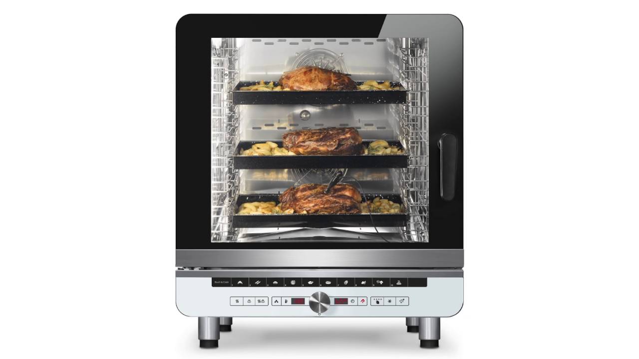 Horno con puerta de cristal panoramica dotado de control electromecanico con tecnologia Ecospeed Dynamic, además de un panel de mandos de selectores electromecanicos con indicadores de funcionamiento, sistema de lavado manual, con empalme de ducha externa, cuenta con iluminación cámara led y respiradero cámara manual, con capacidad para hacer hasta 80 comidas diarias. Consultar capacidad de comensales según el modelo de horno.
