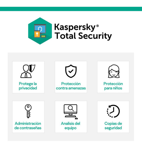 Kaspersky Total Security # Multi-Device, ningún aspecto de tu seguridad digital se deja en manos del azar. Nuestra solución de seguridad definitiva más reciente protege tu privacidad, finanzas, identidad, fotos, archivos y familia contra las amenazas en Internet y mucho más. Protege tu vida digital frente a amenazas actuales en Internet, te ofrece la protección definitiva para PC, Mac y Android, Ayuda a proteger tu privacidad contra webcams espÃas, delincuentes cibernéticos etc, Protege tu dinero en operaciones bancarias y compras online, Protege tu identidad, fotos, archivos y activos digitales, Protege a tus hijos frente a amenazas online, Simplifica la gestión de la seguridad (todos tus dispositivos) desde un solo lugar. Protege eficientemente (para que tus dispositivos no se afecten por el antivirus). Beneficios: SEGURIDAD: Protege contra virus, spyware, phishing, troyanos, ransomware y sitios web peligrosos. PARA DISPOSITIVOS PC, MAC Y MÓVILES: Protege todos tus dispositivos, sin importar la combinación de computadoras y dispositivos android que utilices, te ayudamos a protegerlos, asà como a bloquear, borrar y localizar, PRIVACIDAD: Te ayudamos a bloquear el phishing y los programas espias y de rastreo para proteger tus datos personales, impide que desconocidos monitoreen tus comportamientos en linea y que además que utilicen tu cámara Web para espiarte. Tambien protegemos tus datos cuando te conectas a una red pública. SAFE MONEY: Añade un nivel de seguridad adicional contran defraudadores cebernéticos, cuando uses los servicios de banca en linea o realices compras. CONTROL PARENTAL: Bloquea el contenido inapropiado, bnloquea sitios y te ayuda a gestionar el uso de las redes sociales, haciendo fácil proteger a tus hijos de los peligros de la internet. RENDIMIENTO: Combina seguridad y eficiencia, de modo que tus dispositivos pueden mantener su rendimiento con nuestras tecnologÃas que trabajan “en segundo plano”. SIMPLICIDAD: Puedes administrar tu seguridad desde cualquier lugar en el que puedas conectarte a internet por medio de la cuenta gratuita My Kasperseky. SAFE KIDS: Te ayuda a guiar a tus hijos en cuanto al tiempo de uso del dispositivo y la seguridad, de modo que solo accedan a los tipos de sitio web, contenido y aplicación que consideres apropiados, CONTRASEÑAS: Almacena de forma segura las contraseñas para un fácil acceso a dispositivos PC, Mac y móviles. COPIA Y CIFRADO DE ARCHIVOS: Realiza copias de seguridad de fotos, música y archivos y cifra datos en PC.