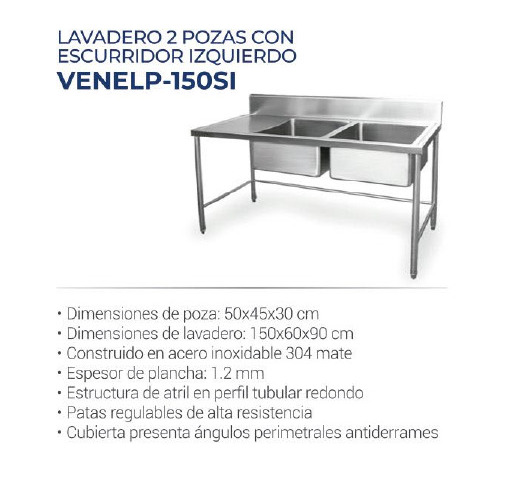 Lavaplatos 2 taza 45x45x30cm + secador izquierdo VENELP-150SI