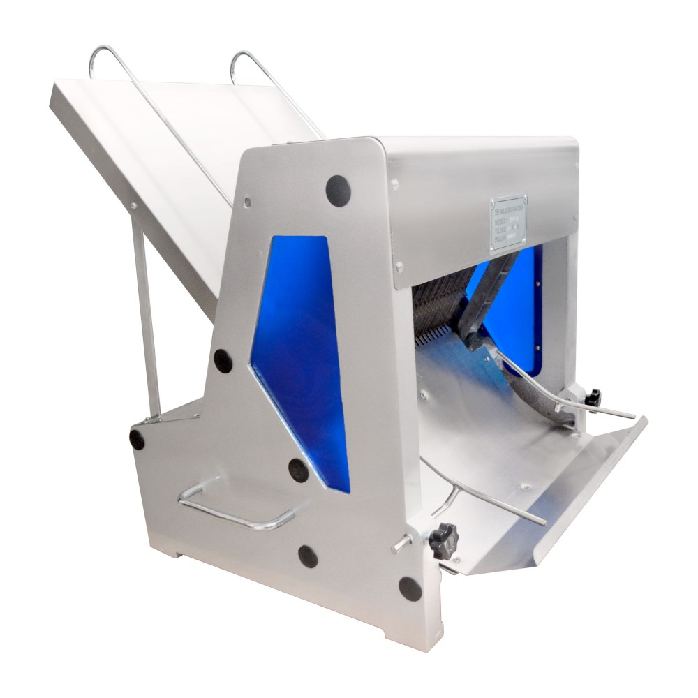 La Rebanadora de Pan es una maquina diseñada para rebanar productos de panadería cocidos (pan de molde u otros panes), en porciones de igual espesor. Es una maquina robusta, fiable de fácil manejo que se adapta a las diferentes necesidades de obrador. Por su armado compacto, adecuada velocidad lineal, es una maquina silenciosa con una mínima vibración, preparada para un trabajo continuo y exigente. Bandeja de Alimentacion y descarga en acero inoxidable.