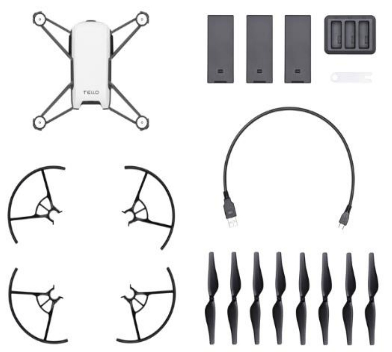 Aparte de la batería mencionada anteriormente, el Tello también incluye cuatro pares de hélices y guardas de hélice. Las placas superiores multicolores están disponibles por separado para personalizar el aspecto de su avión no tripulado.